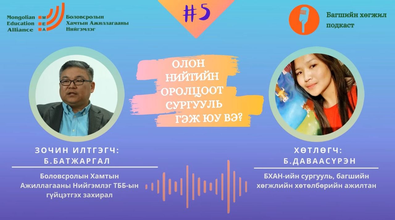 Боловсролын Хамтын Ажиллагааны Нийгэмлэгээс боловсролын байгууллагын нийт ажилчдад зориулан гаргаж буй "Багшийн хөгжил" подкастын 5 дахь дугаарт БХАН-ийн гүйцэтгэх захирал Б.Батжаргал уригдан оролцлоо. Бид удаах 3 дугаарт "Олон нийтийн оролцоот сургууль" сэдвийн хүрээнд ярилцах бөгөөд энэхүү дугаарт дараах агуулгын хүрээнд ярилцлаа.